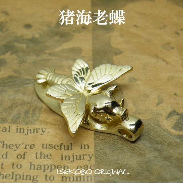 ■猪海老蝶ペンダント(限定品) 猪海老蝶ペンダントは、猪、海老、蝶をミックスした独創的なデザインのペンダントです。このペンダントを身につけることで、胸元に個性的な印象を与え、日常のスタイルに特別なアクセントを加えることができます。カジュアルなシーンはもちろん、特別なイベントやお出かけにもぴったりのアイテムです。 この猪海老蝶ペンダントは、熟練の職人によって丁寧に制作された逸品で、それぞれのモチーフの美しさが融合した魅力的なデザインが際立っています。自分用としてはもちろん、ユニークなアクセサリーを愛する友人や家族への贈り物としても非常におすすめのアイテムです。このペンダントを身につけることで、あなたの胸元に特別な魅力が宿り、思い出に残る瞬間を楽しむことができるでしょう。 猪海老蝶ペンダントが、あなたの日常に個性的なアクセントを加えますように。この特別なペンダントで素敵な時間をお楽しみください。 BRP-061 地金種 真鍮 寸法 横×縦 27.5×35.5mm 重量 13.1g